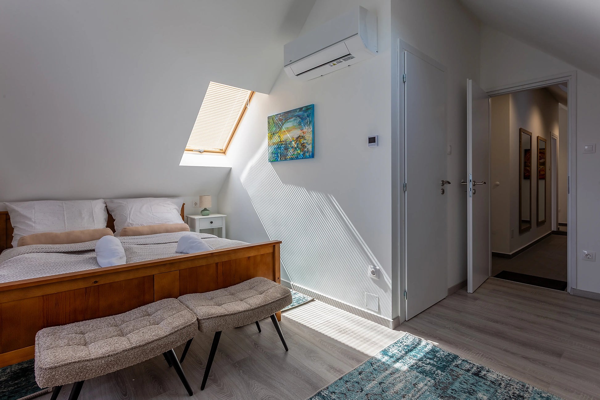 Ez a deluxe szoba a vendégház emeletén foglalható három kétszemélyes szoba egyike. A 21 négyzetméteres szobához saját fürdőszoba tartozik. Nem pótágyazhatók, babaágyat nem tudunk elhelyezni bennük. Az apartman földszintjén közös használatú, jól felszerelt konyha található.