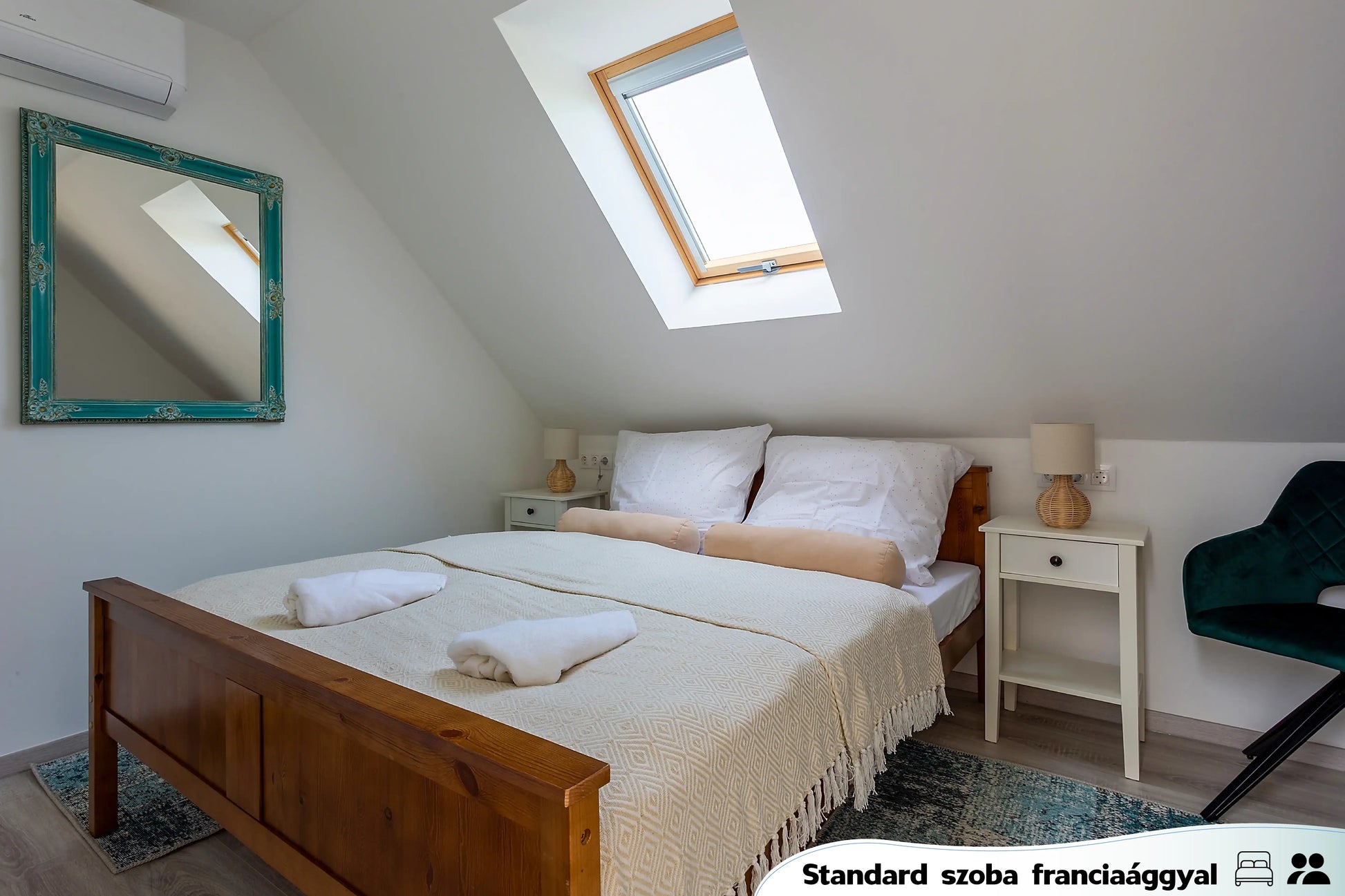 A standard szoba a vendégház emeletén foglalható három kétszemélyes szoba egyike. A 17 négyzetméteres szobához saját fürdőszoba tartozik. Nem pótágyazhatók, babaágyat nem tudunk elhelyezni bennük. Az apartman földszintjén közös használatú, jól felszerelt konyha található.